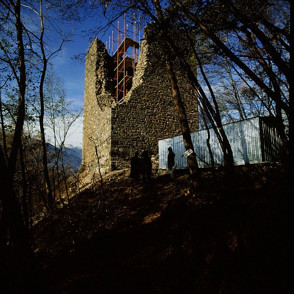 Turmruine aus dem 13. Jh. Am steingerahmten Rundbogentor Wappen der Herren von Trautson, Bruchsteinmauerwerk in regelmäßiger Lagerung.