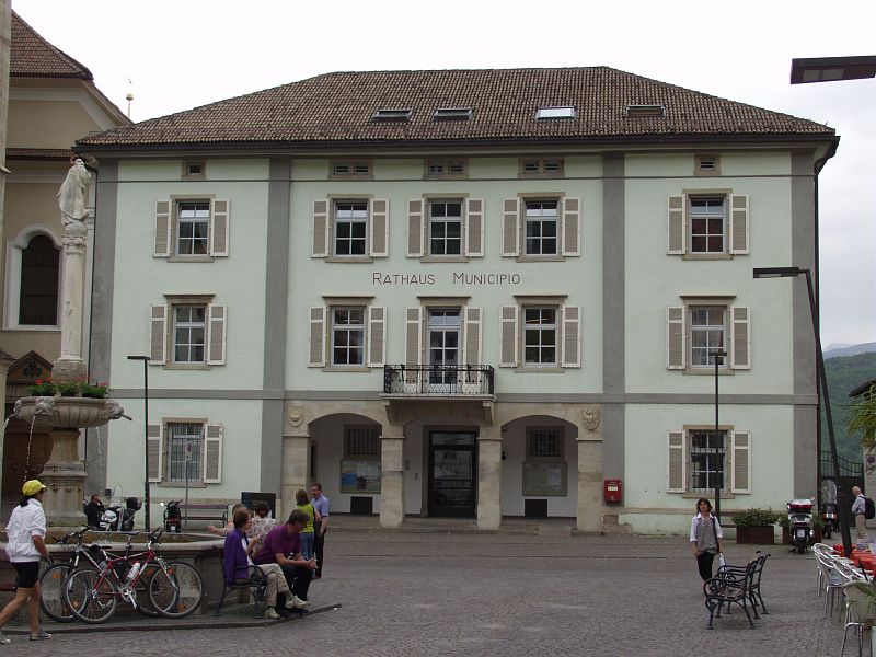 1852 an der Stelle des alten Rathauses von Baumeister Georg Gamon in Bozen errichtet. Fassade mit strenger vertikaler Gliederung, Portikus mit drei Flachbogenöffnungen, Balkon mit Schmiedeeisenbrüstung von Johann Leemann. Steingerahmte Rechteckfenster. Im Innern 1981-1983 umgebaut.