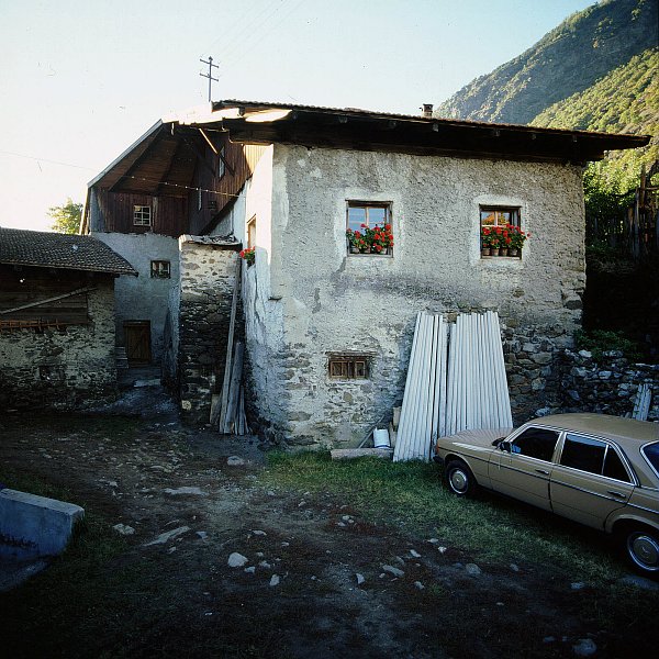 Einhof mit verbrettertem Bundwerkgiebel und weit vorkragendem Dach. Gemauerte Freitreppe. spitzbogige Haustür (16. Jh.), Fenster mit Putzrahmungen.