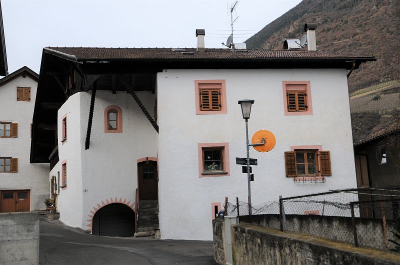 Wohnhaus.Spätmittelalterlicher Bau mit vorkragendem Dach auf zwei geschnitzten Streben über der ausgesparten Südwestecke. Freitreppe, innen gewölbter Aufgang, tonnengewölbte Küche, Fenster mit Putzrahmungen.