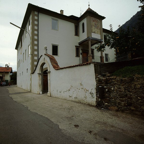 Regelmäßiger Renaissancebau mit rundbogigem Hoftor in Marmorrahmung (bez. 1612). Nach Erkervorbau auf zwei toskanischen Säulen mit barockem Fresko (Der Hl. Bernhard empfängt die Ordensregel, Sonnenuhr). Tür mit Sternmotiv.