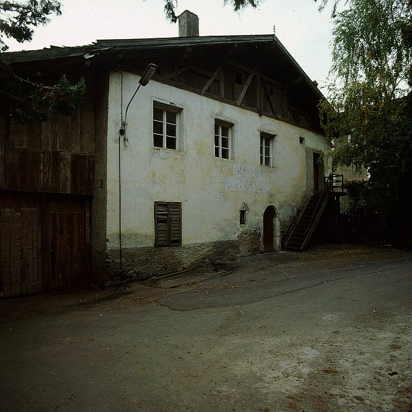 Rundbogentür in abgefaster Marmorrahmung. Daneben schmales Fenster mit Steingewände und Dreieckgiebel, darin Reliefkopf.