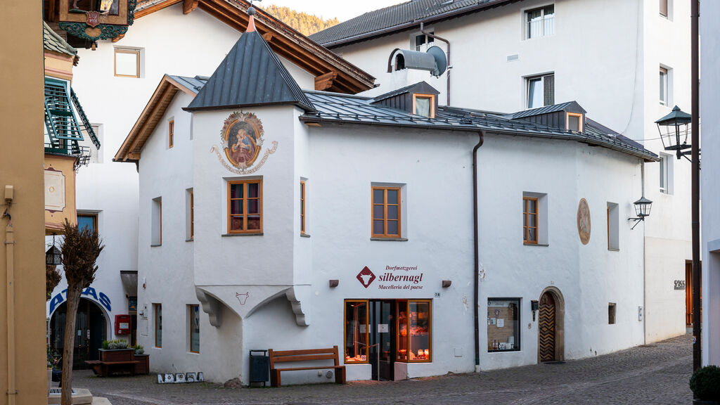 Spätgotischer Eckerker auf Kragsteinen mit Turmabschluß. Rundbogige Haustür in Steinrahmung mit altem Türflügel. Barockes Fassadenfresko (Mariahilf), bez. 1754.