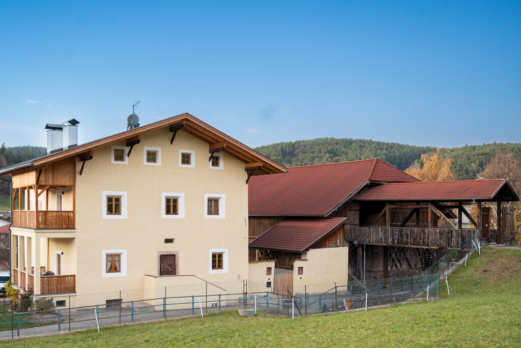 Zwischen Wohnhaus und Stadel Hofmauer mit zwei Freskennischen. Am Wohnhaus kurze Freitreppe, steingerahmte Rechtecktür mit Wappen am Sturz und Jahreszahl 1615. Gewölbter Hausgang mit Inschrift und Jahreszahl 1617 an der steingerahmten Kammertür.