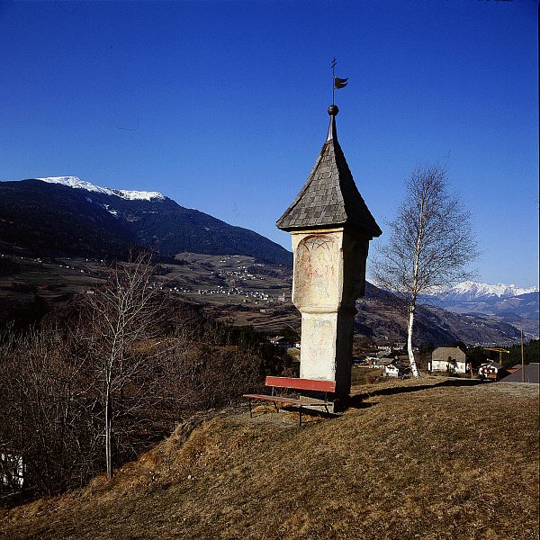 Viereckiger Schaft, Nischenaufsatz, Pyramidendach. Um 1500. Freskobemalung (Epiphanie, Kreuztragung, Kreuzigung, Heilige). 1975 hierher versetzt.