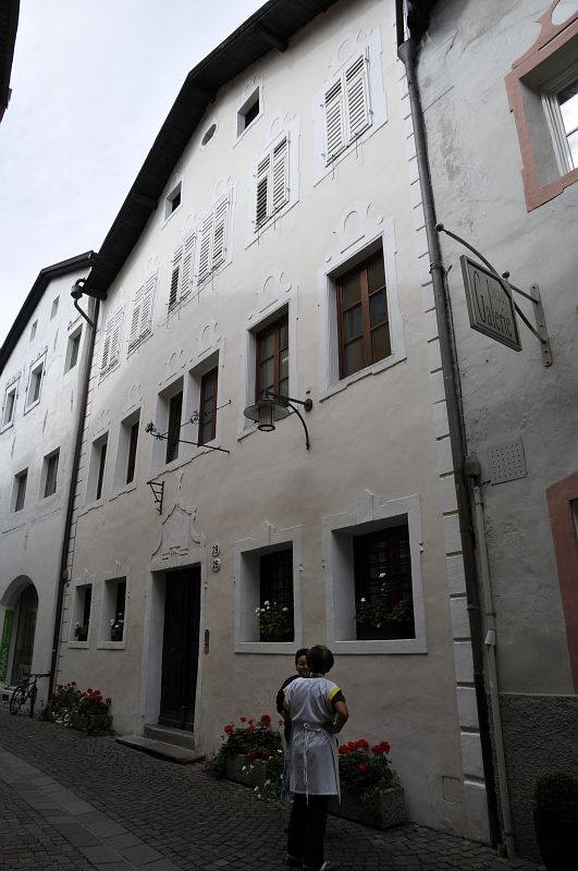 Barocke Fassadengestaltung. Tür und Fenster mit Putzrahmen und Volutengiebeln, 18. Jh.