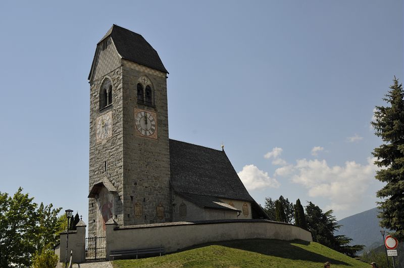 1202 erwähnt. Im 14. Jh. umgebaut. Chorturmkirche, Turm mit Krüppelwalmdach, Chor mit Kreuzrippengewölbe, ebenso im Schiff. Freskenausstattung 15.Jh. (Chor und nördliche Seitenschiffswand bemalt). Friedhofskapelle: Mittelalterlicher Viereckbau mit Rundapsis, im 17. Jh. umgebaut. Tonnengewölbe, Bauernmalerei (Höllenrachen, Sensenmann, Lebensrad, Jüngstes Gericht, Dreifaltigkeit).