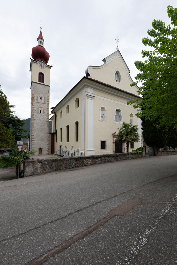 Turm mit Zwiebelhaube und Laterne auf romanischem Unterbau. Kirche 1810-1814 erbaut. Flachbogig abschließender, abgesetzter Chor mit Flachkuppel, Wandpfeilerraum mit Tonnengewölbe, Flach- und Karniesbogenfenster. Freskenausstattung von Josef Schelski, 1814.