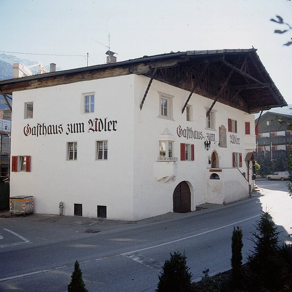 Freitreppe mit steingerahmter Spitzbogentür, Eckerker, polygonaler Fassadenerker. Geschnitzter Bundwerkgiebel, bez. 1717. Fresko (Heilige Familie), 18. Jh.; Reste von Eckbemalungen.