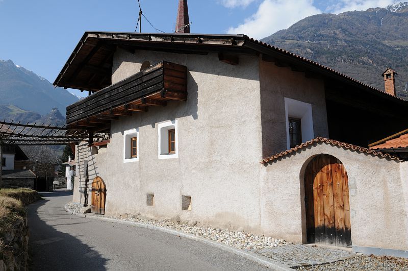 Wohnhaus. Ursprünglich gemauerte, heute hölzerne Freitreppe. Spitzbogige Haustür. Durchgehender tonnengewölbter Gang. Stube mit Leistengetäfel und Jahreszahl 1782, gewölbter Erker. Tonnengewölbte Küche.