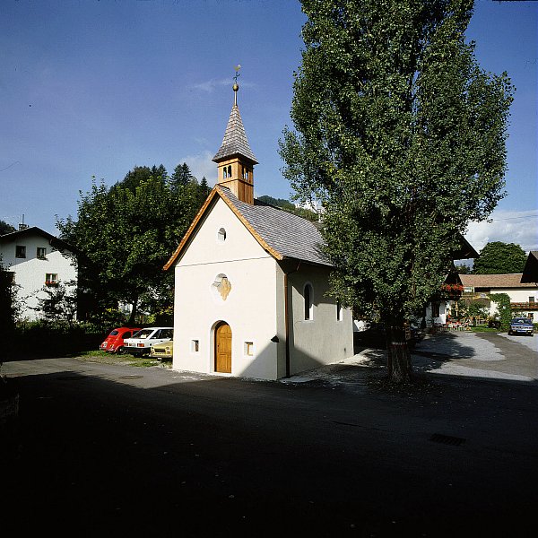 Rechteckbau aus dem beginnenden 18. Jh., hölzerner Dachreiter mit Pyramide, Kreuzgratgewölbe, über der Rundbogentür Vierpaßfeld, Rundbogenfenster. Am Gewölbe Stuckdekorationen. Schindeldach.