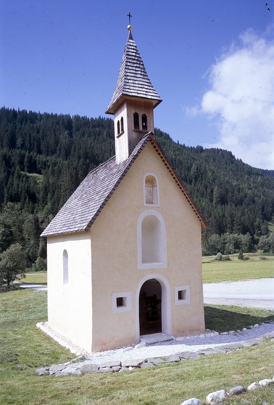 Barocker Kapellenbau aus der ersten Hälfe des 18. Jh.s, Hölzerner Fassadendachreiter (Pyramide), gerader Chorschluß, Kreuzgratgewölbe, Rundbogentür, -fenster, Skulpturennischen. Schindeldach.