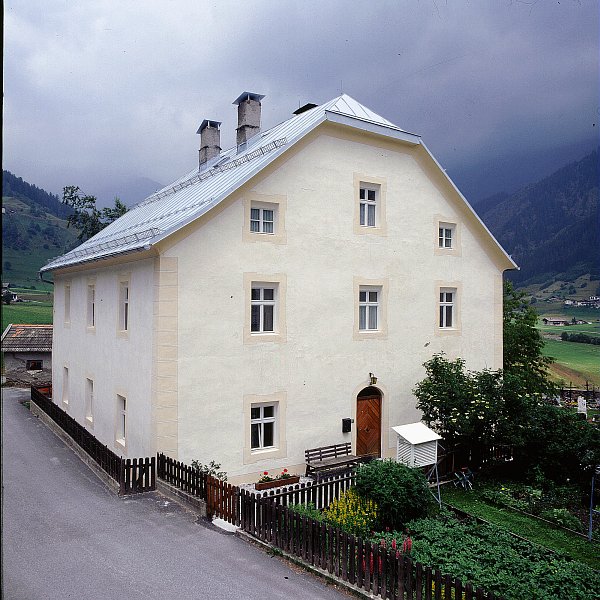 Um 1764 erbaut. Krüppelwalmdach, Flachbogentür. Regelmäßige Fensterreihen, gemalte Fensterumrahmungen.