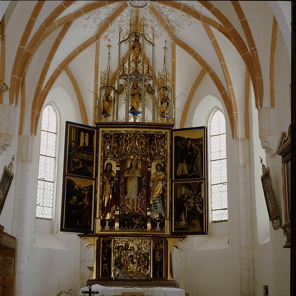 Spätgotischer Bau, um 1480 errichtet. Polygonaler Chorschluß, seitlicher Spitzturm, Vorhalle. Spitzbogenportal aus weißem Marmor, Sternrippengewölbe mit spätgotischen Dekorationsmalereien.