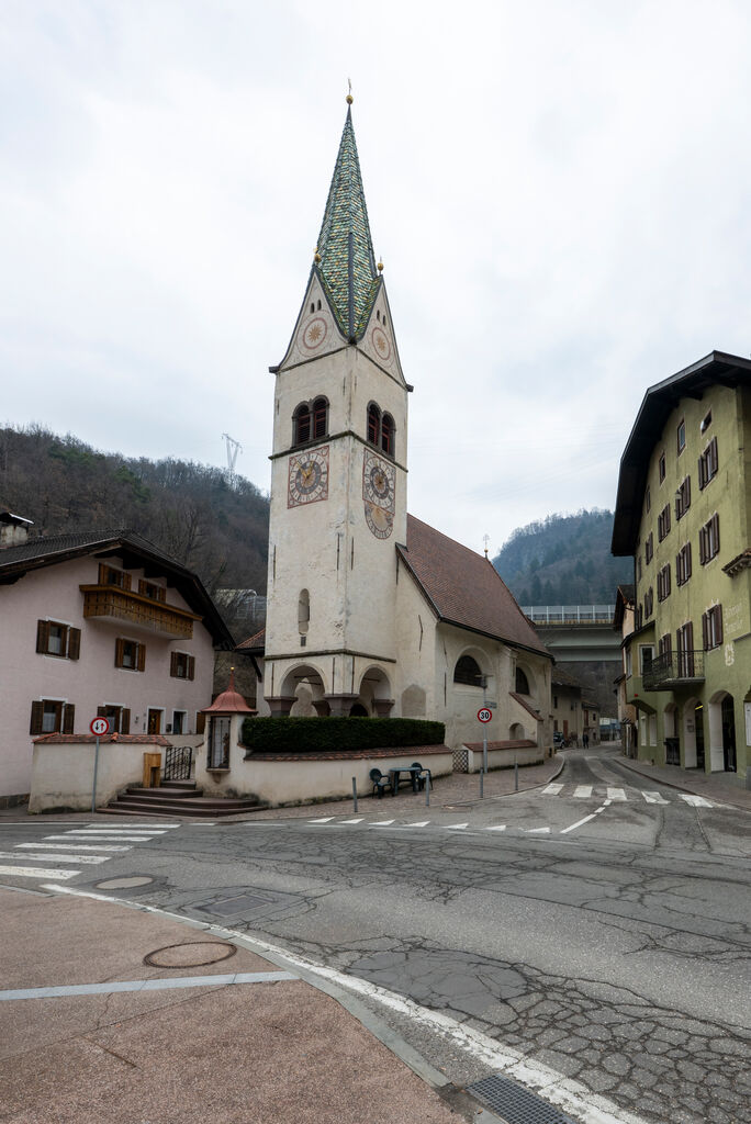 Ursprüngliche Hospizkirche, 1331 geweiht. 1649 umgebaut. Fassadenspitzturm mit Vorhalle auf Porphyrpfeilern, polygonaler Chorschluß, Gratgewölbe. Im Norden Zubau von 1930 (Arch. Marius Amonn). Wandgemälde an der Westwand, um 1590; am Triumphbogen (Verkündigung), 1728.