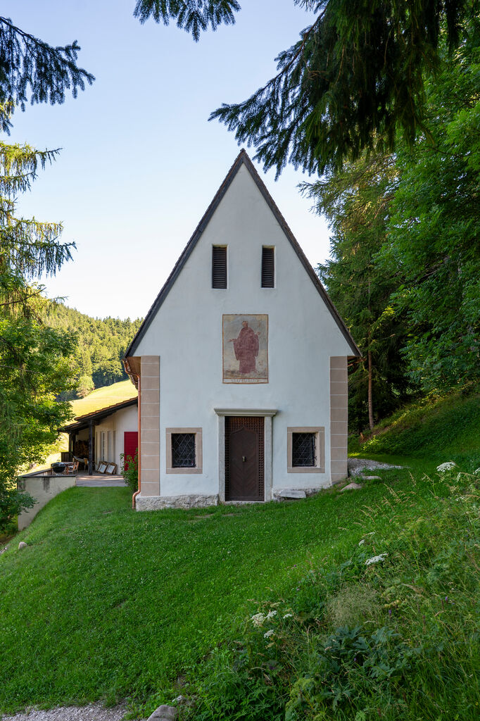 Einfacher Kapellenbau aus dem 17. Jh. mit rundbogigem Chorschluß, Rechtecktür und steilem Satteldach mit Schindeln.