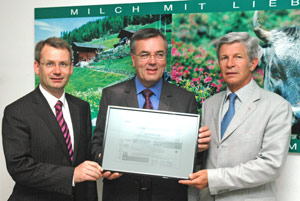 (LPA) Dass sich Wirtschaft und Umweltschutz nicht ausschließen müssen, zeigt das Beispiel des Unternehmens Milkon, das heute (17. Mai) im Beisein der Landesräte Michl Laimer und Hans Berger mit dem Zertifikat nach der internationalen Umweltnorm ISO 14001 ausgezeichnet worden ist. Das Zertifikat steht am Ende einer Optimierung des Produktionsprozesses, die von der Landesumweltagentur begleitet worden ist.