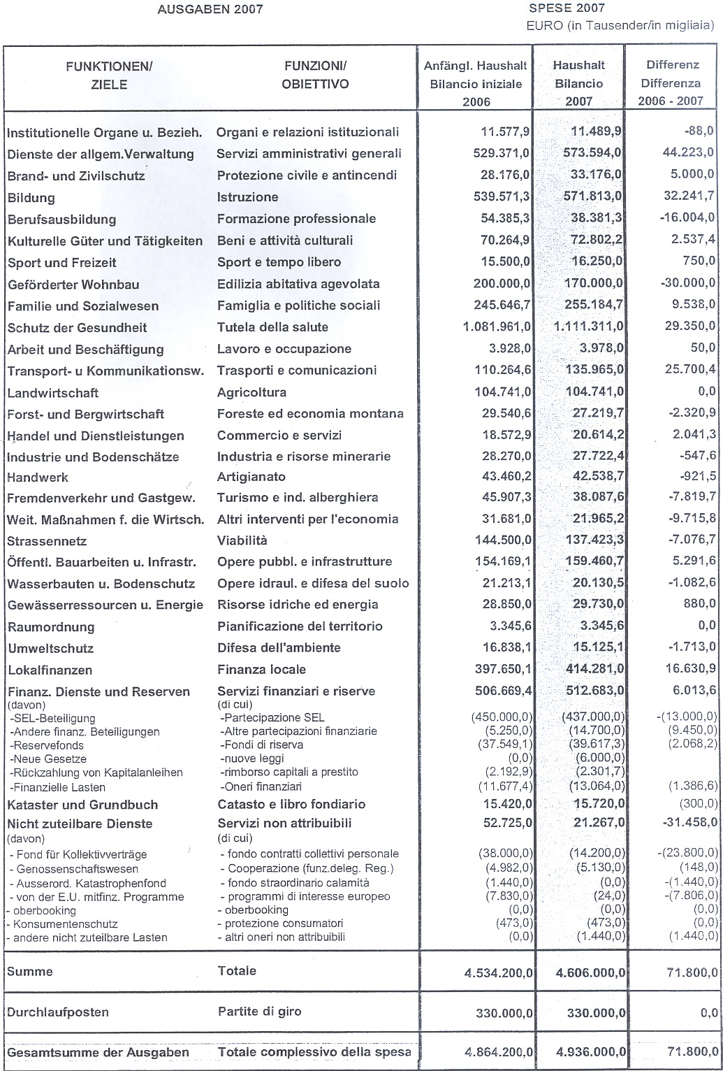 Der Staat hat für 2007 den internen Stabilitätspakt für Regionen und Provinzen mit Sonderstatut verschärft und schreibt eine einzige Ausgabenhöchstgrenze für Investitionsausgaben und laufende Ausgaben vor: nämlich minus 1,8 Prozent bezogen auf die Gesamtausgaben 2005 wovon lediglich die Sanitätsausgaben ausgenommen sind.