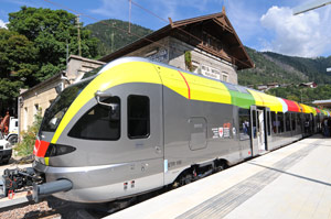 (LPA) Silbern glänzend und ganz im Zeichen des Südtirol-Panoramas: So sieht die Zukunft der Pusterer Bahn aus, der erste der neuen Züge, der heute (28. August) von Landeshauptmann Luis Durnwalder und den Landesräten Thomas Widmann sowie Hans Berger am Bahnhof in Mühlbach in Empfang genommen worden ist.