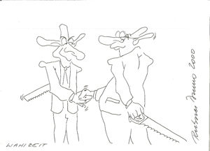 Witzig, ein bisschen böse und auch ganz schön hinterhältig - in der Ausstellung im Kornkasten in Steinhaus zeigen die drei "frechen Knappen" Alois Steger, Josef Steger und Bruno Rubner - die ganze Palette der Karikatur. Inhaltlich greifen sie verschiedene Themen auf. Sie nehmen Alltagssituationen aufs Korn, interpretieren auf ihre Weise Situationen des öffentlichen Lebens, provozieren und klagen politische Entwicklungen im Land an. Jeder Künstler zeigt auf seine ganz besondere Art und Weise, wie er Situationen erlebt und sie dann festhält.
