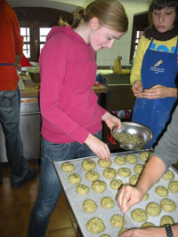 Arbeitsgruppen bunt gemischt aus den sechs Klassen dieses Jahrgangs bereiteten das Fest vor. Die Gruppe „Brot“ backte erstmals in dem neu errichteten Holzbackofen. Die Milch vom Übungshof wurde zur Herstellung von Butter, verschiedenen Topfenaufstrichen und Frischkäse verwendet. Andere Schüler und Schülerinnen bereiteten unter fachkundiger Anleitung Hauswürste zu und kochten dazu einen Unterlandler Plent. Die Kräuter aus dem Schulgarten wurden zu Salben, Ölen und Kräutersalzen verarbeitet. Am Stand der Tirtlan, Apfelkiachln und Kirchtigkropfn war der Andrang besonders groß. Zu den gebratenen Kastanien gab es frisch gepressten Apfelsaft, Apfelglühmix oder eine Kostprobe der Weine aus der Kellerei der Oberschule.