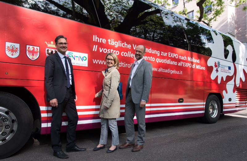 Ab dem 1. Mai bis zum 31. Oktober fährt der Bus täglich von Innsbruck (ca. 03.15 Uhr), Schlanders (ca. 03.40 Uhr), Meran (ca. 04.31 Uhr), St. Leonhard in Passeier (ca. 03.55 Uhr), Dorf Tirol (ca. 03.55Uhr), Schenna (ca. 04.05 Uhr), Sterzing (ca. 04.00 Uhr), Bruneck (ca. 03.40 Uhr), Brixen (ca 04.30 Uhr), Gröden (ca. 03.50 Uhr), Bozen (ca. 05.05 Uhr), dem Überetsch (ca. 05.35 Uhr), Unterland (ca. 05.45 Uhr), San Michele all'Adige (ca. 06.05 Uhr), Trient (ca. 06.15 Uhr) und Rovereto (ca. 06.40 Uhr) nach Mailand zur Expo. Der Euregio-Bus trifft täglich pünktlich zu Messebeginn um 10 Uhr auf der Expo ein und bringt die Mitreisenden nach siebenstündigem Aufenthalt auf dem Expo-Gelände wieder sicher und bequem nach Hause.
