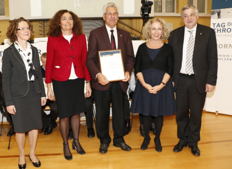 Besonders verdiente Chronisten, und zwar Martha Krapf Schrott aus Kollmann, Christian Moroder aus Stern, Erwin Lona aus Margreid, Werner Fuchs aus Sterzing, Serafin Bacher aus Rein, Richard Furggler aus St. Johann im Ahrntal, Georg Gamper aus Bozen, Walburg Ladurner Kiem aus Algund und Robert Kaserer aus Tschars haben von Landesrat Mussner eine Ehrenurkunde für ihre Verdienste im Chronistenwesen überreicht bekommen.