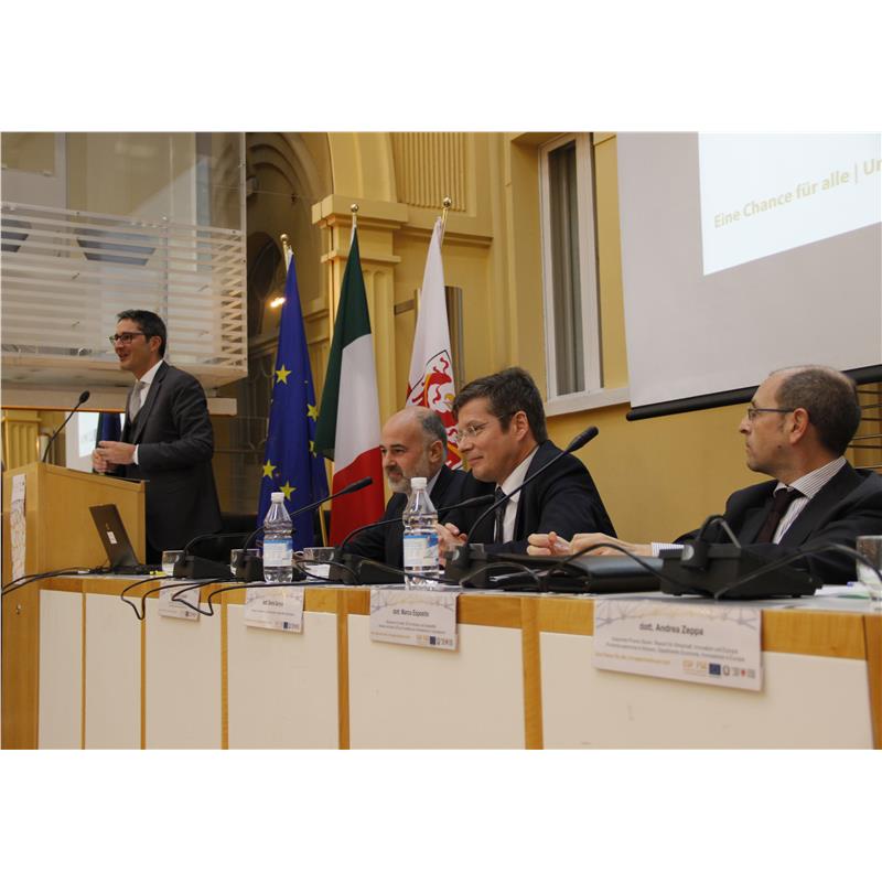 Im Sommer hat Brüssel das von Südtirol vorgelegte "Operationelle Programm Europäischer Sozialfonds 2014-20" genehmigt. Heute fand im vollbesetzten Innenhof des Bozner Palais Widmann die Auftaktveranstaltung für die neue Programmperiode statt, an der neben Landeshauptmann Arno Kompatscher der Direktor der Landesabteilung Europa, Albrecht Matzneller, Claudio Spadon von der Verwaltungsbehörde des ESF, Vertreter der zuständigen EU-Generaldirektion, des italienischen Arbeits- und Wirtschaftsministeriums sowie der gesamtstaatlichen Agentur für territoriale Kohäsion teilnahmen.