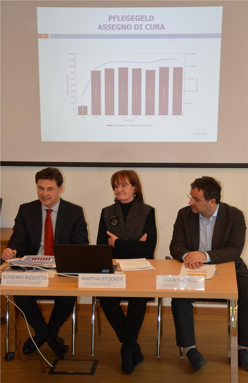 Die Agentur für wirtschaftliche und soziale Entwicklung (ASWE) hat im vergangenen Jahr für den sozialen Bereich insgesamt 260 Millionen Euro an über 30.000 Beitragsempfänger ausbezahlt, wie von Direktor Eugenio Bizzotto im Detail aufgezeigt wurde. Den größten Anteil macht dabei mit knapp 200 Millionen Euro (75 Prozent) das Pflegegeld aus – was sich mit den Prognosen zu den aktuellen Herausforderungen in der Gesundheitsversorgung deckt. Konstant sind auch die von der ASWE ausbezahlten Leistungen für Zivilinvaliden und Menschen mit Behinderungen: Mehr als 40 Millionen Euro wurden an 7500 Beitragsempfänger ausbezahlt, das sind um 0,2 Prozent weniger als im Jahr 2014. An Vorsorgeleistungen bezahlte die ASWE im vergangenen Jahr mehr als 22 Millionen Euro an knapp 7900 Beitragsempfänger aus. Dabei stich vor allem die Hausfrauenrente mit mehr als 2000 Begünstigten, einem aktuellen Finanzvermögen von 255 Millionen Euro und einem ausgeglichenem Fonds hervor.