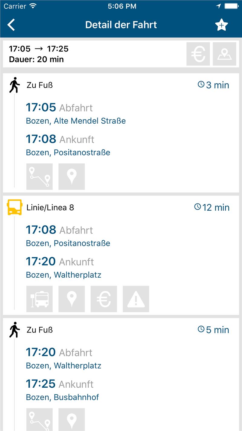 Neu dazu gekommen ist die Tarifauskunft: Für jede Strecke zeigt die App automatisch den jeweiligen Tarif als Richtwert an, sowohl für Einzelfahrschein und Wertkarte als auch für den Südtirol Pass und für den Südtirol Pass family, wobei hier die Fahrpreise gemäß der einzelnen Tarifstufen getrennt aufgeschlüsselt werden.