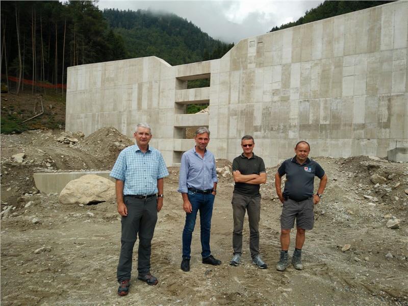 Als erste in der Reihe der Baustellen wurde ene am Hirschbrunnbach im Tauferer Tal in Augenschein genommen; dort ensteht eine Rückhaltesperre, die St. Georgen in der Gemeinde Bruneck vor der drohenden Gefahr durch Muren schützen soll. Mit dieser Baumaßnahme wird das Gebiet der roten und blauen Gefahrenzone im ausgewiesenen Gefahrenzonenplan entschärft. Derzeit befinden sich laut Gefahrenzonenplan der Gemeinde Bruneck viele Gebäude von St. Georgen in ausgewiesenen Gefahrenzonen. "Es bestand also Handlungsbedarf", erklärt Rudolf Pollinger, Direktor der Agentur für Bevölkerungsschutz, "und mit dem Bau dieses Rückhaltebeckens sind wir imstande, die Gefahr im Siedlungsraum stark einzudämmen". Die zehn Meter hohe Rückhaltesperre aus Stahlbeton kann bei Bedarf an die 40.000 Kubikmeter Geschiebematerial zurückhalten. Bis zum Spätherbst sollen auch zwei Dämme errichtet sein, welche die Rückhaltesperre an die Bergflanken anbinden und somit das Rückhaltebecken abrunden. Die Dämme werden beckenseitig mit Zyklopensteinen verstärkt, talseitig möglichst naturnah gestaltet und bepflanzt. Im Zuge der Arbeiten müssen Vorarbeiter Hubert Brugger und seine Männer auch das Bachbett talseitig der Rückhaltesperre auf einer Länge von 50 Metern mit Beton und Zyklopensteinen befestigen, um eine Tiefenerosion zu verhindern. Die Baumaßnahme mit einem Kostenumfang von 1,2 Millionen Euro wird mit vom Staat zur Verfügung gestelltem (Fondo per lo sviluppo e la coesione FSC) Geld finanziert. Für Projekt und Bauleitung zeichnet Martin Moser vom Landesamt für Wildbach- und Lawinenverbauung Ost verantwortlich,