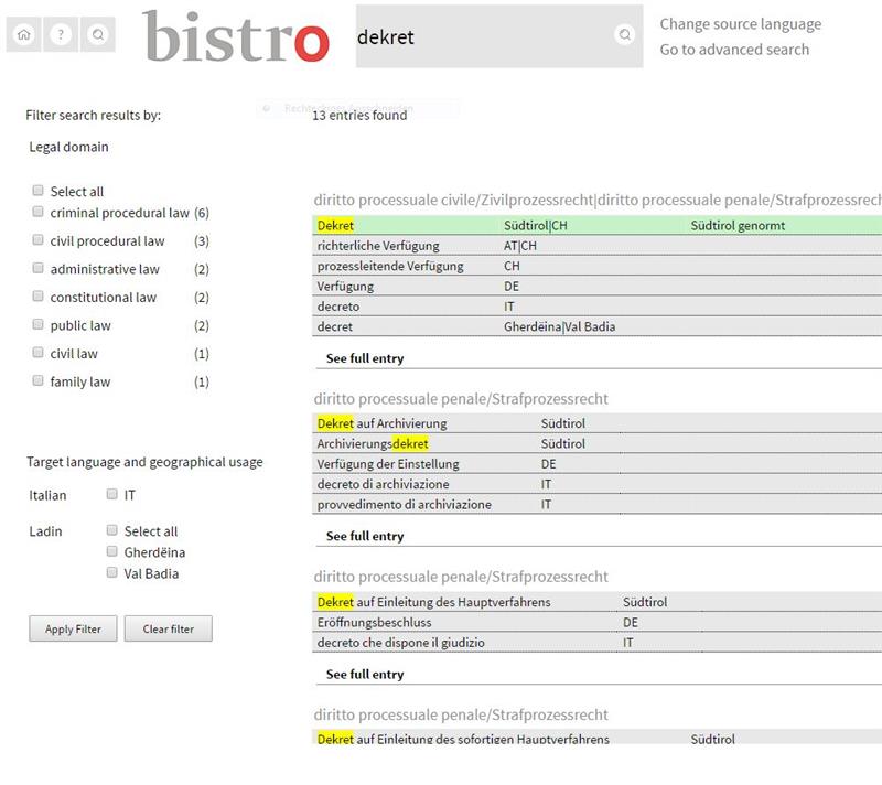 Die deutsch-italienische Datenbank umfasst zahlreiche nützliche Termini aus den Bereichen Recht und Verwaltung. Ebenso finden sich darin die normierten Termini, die von den Verwaltungsmitarbeitenden zwingend zu verwenden sind. Schließlich wurden zunehmend auch ladinische Begriffe in die Datenbank aufgenommen. Im Unterschied zu vergleichbaren europäischen Terminologiedatenbanken bietet "bistro" nicht nur Übersetzungen in die Sprachen Deutsch, Italienisch und Ladinisch, sondern unterscheidet bei deutschen Begriffen auch, ob sie aus der österreichischen, bundesdeutschen oder schweizerischen Rechtsordnung stammen. Wird eine Bezeichnung in Südtirol als Äquivalent italienischer Rechtstermini gebraucht, ist dies ebenfalls vermerkt. Zu finden ist "bistro" unter bistro.eurac.edu oder über das Südtiroler Bürgernetz. Genutzt werden kann es kostenlos.