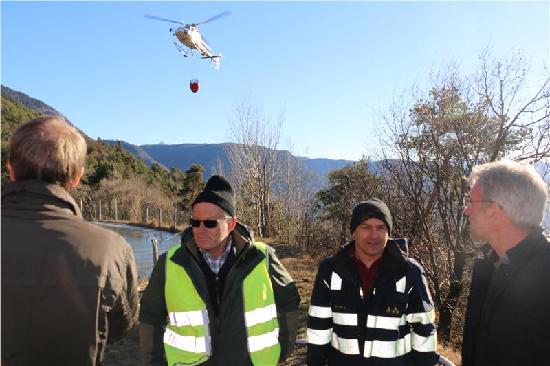Mit dem Direktor des Forstinspektorates Bozen 1 Martin Schöpf und dem Einsatzoffizier der Berufsfeuerwehr Martin Gasser besprachen Landesrat Arnold Schuler und Ressortdirektor Klaus Unterweger am Löschweiher in Seit die Situation. Mit 100 Hubschrauberflügen gestern und 50 heute wurden je Flug 800 bis 900 Liter Wasser mit brandhemmendem Mittel abgeworfen, zudem wurden auch Einsatzkräfte und Material in ads unwegsame Geläde gebracht. Beim letzten Hubschrauberflug mit Löschwasser kurz vor 15.00 Uhr galten 95 Prozent des Brandes als gelöscht; trotzdem wird heute noch eine Nachtwache eingesetzt. Landesrat Schuler zeigte sich beeindruckt von der Leistung der Einsatzkräfte in extrem schwierigem Gelände: "Es hat sich wieder gezeigt, wie gut im Ernstfall die Zusammenarbeit zwischen den einzelnen Behörden und Freiwilligen wie auch privaten Unternehmen schnell und reibungslos funktioniert; auch in der Nacht wurde die Brandwache garantiert, und das in einem Gelände, wo es schon bei Tag schwierig und gefährlich ist, sich zu bewegen".