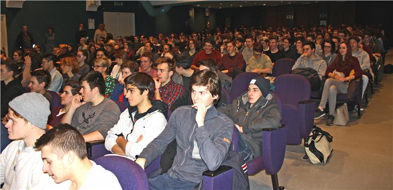 Eines der geplanten Treffen stand gestern (2. Februar) an der italienischen technologische Fachoberschule "Galileo Galilei" in Bozen auf dem Programm. Daran nahmen mehr als 400 Schülerinnen und Schüler aus sechs Bozner Oberschulen teil. Schuldirektor Carlogero Arcieri und Mauro Chiarel vom Unternehmen Tangram GmbH als Bezirksvertreter des Unternehmerverbandes begrüßten die Teilnehmer.