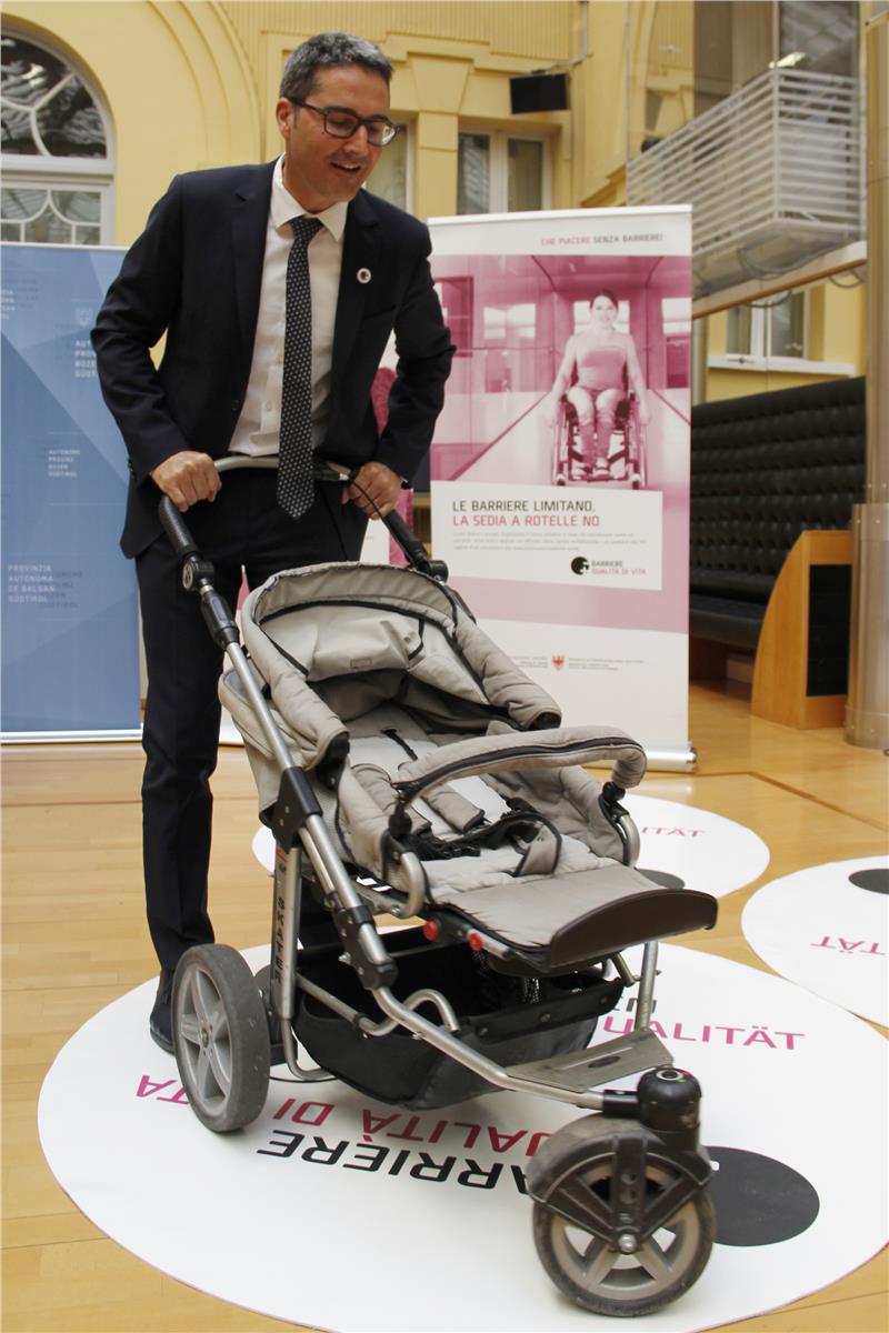 Auch Landeshauptmann Arno Kompatscher wies auf die Relevanz des Themas Barrierefreiheit hin: „Barrieren betreffen nicht nur Menschen mit Behinderung, sondern einen Großteil der Bevölkerung. Selbst bei einfachen Abläufen im Alltag kann es zu einer Einschränkung der Lebensqualität kommen.“ Deshalb sei es von großer Wichtigkeit, bereits bestehende Strukturen anzupassen und für Neubauten die Bestimmungen zur Barrierefreiheit einzuhalten, so Kompatscher. Die Umsetzung barrierefreier Lebensräume ist aber nicht nur in öffentlichen Gebäuden zu berücksichtigen, sondern sollte auch in den eigenen vier Wänden eine Rolle spielen. Vor und hinter der Eingangstür eines jeden Gebäudes, auch um die Tür mit einem Kinderwagen bedienen zu können, vor den Aufzügen, um einen Richtungswechsel vorzunehmen, bei Richtungsänderungen in den Gängen, vor den Wohnungstüren in den Kondominien, um mit Kind am Arm und Einkaufstasche ausreichend Platz zu haben: überall dort sind ausreichende Rotationsflächen notwendig. „Weniger Barrieren heißt vor allem mehr Lebensqualität. Denken wir dabei auch noch an den demographischen Wandel, stellen wir fest, dass dieses Thema künftig immer mehr Menschen betreffen wird“, sagte der Landeshauptmann.