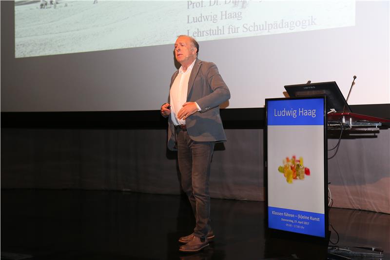 Ludwig Haag hielt anschließend ein Impulsreferat zum Thema "Klassenführung heute". Für ihn stellt die Klassenführung eine zentrale Lehrerkompetenz dar. Eine effiziente Klassenführung trage dazu bei, sowohl Unterricht zu organisieren, als auch Unterrichtsstörungen zu vermeiden oder beseitigen. In diesem Sinne seien Lehrer mit Führungskräften oder Managern zu vergleichen. "Erziehung und Unterricht gehören zusammen", betonte Haag. Er wies auf die enge Wechselwirkung zwischen Schülern und Lehrern hin, daher könne es auch keine Patentrezepte für die Klassenführung geben. Kommunikation, Organisation und Regulation stellen laut seiner Meinung die Grundlage für die Klassenführung dar. Er zeigte aber auch auf, dass sich der Begriff der Klassenführung im Laufe der letzten Jahrzehnte stark verändert hat: So war dieser in der Vergangenheit häufig auf den Umgang mit Disziplin und Intervention beschränkt, im Laufe der Zeit wurde er aber auf Lehrerhandeln und die Gestaltung lernförderlicher Lernumgebungen erweitert.