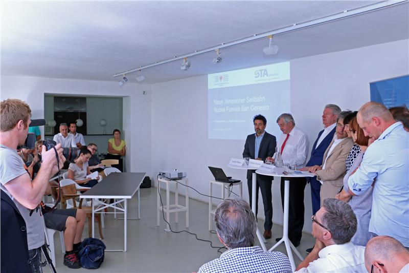 Das Projekt für die neue Seilbahn Bozen-Jenesien haben Mobilitätslandesrat Florian Mussner und die Bürgermeister Renzo Caramaschi (Bozen) und Paul Romen (Jenesien) am 7. Juli gemeinsam mit STA-Direktor Joachim Dejaco und dem Direktor der Landesabteilung Mobilität Günther Burger in Bozen vorgestellt.