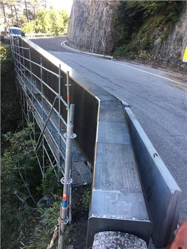 "Die Arbeiten schreiten gut voran", berichtet der Direktor des Straßendiensts, Philipp Sicher. Die lange Steinschlagmauer und die stark beschädigten Geländer der Brücken waren vorerst mit Zementblöcken gesichert worden. Auch besonders wichtige Sicherungsmaßnahmen betreffend Steinschlag und Lawinenabgang wurden durchgeführt. Inzwischen wurden an den zehn Brücken die alten Schutzgeländer abgebaut und durch neue ersetzt. Somit konnten laut Sicher auch alle provisorischen Betonfertigteile zur Straßenbegrenzung entfernt werden, wodurch die Straße wieder breiter ist und sich mit den Schutzgeländern aus braunem Stahl mit abgerundeter glatter Form besser in die Landschaft einfügt und für die Fahrradfahrer bzw. Motorradfahrer die Sicht verbessert.