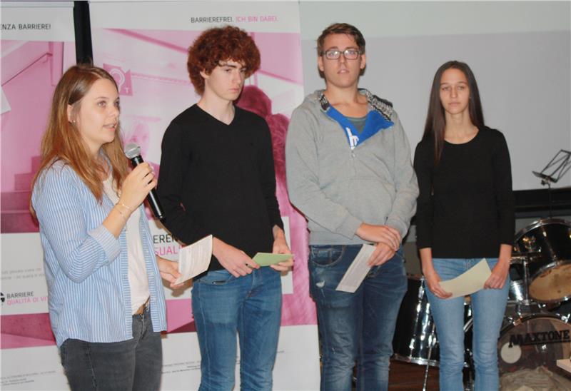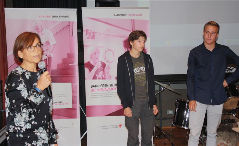 "– Barrieren + Lebensqualität“ - unter diesem Motto stand heute (13. Oktober) die Abschlussveranstaltung der Sensibilisierungskampagne "Barrierefrei - ich bin dabei", die das Landesressort für Gesundheit und Soziales gemeinsam mit dem Dachverband für Gesundheit und Soziales, dem Blindenzentrum, dem Gehörlosenverband, der Arche, der Sozialgenossenschaft IndependentL. und dem Elternverband gehörloser Kinder vor drei Jahren gestartet hatte, um auf architektonische Barrieren aufmerksam zu machen. An der Kampagne beteiligt waren auch die Oberschulen für Bauwesen "Peter Anich" und "A. e P. Delai". Gemeinsam mit den Schülerinnen und Schülern jener Klassen, die sich mit dem Thema Barrierefreiheit beschäftigt haben und ihren jeweiligen Fachlehrerinnen sowie den Direktorinnen Ingrid Keim und Paola Burzacca und mit der Direktorin des Amtes für Menschen mit Behinderung, Luciana Fiocca, zog Sozial- und Gesundheitslandesrätin Martha Stocker heute Bilanz.
