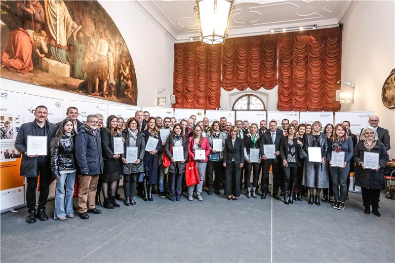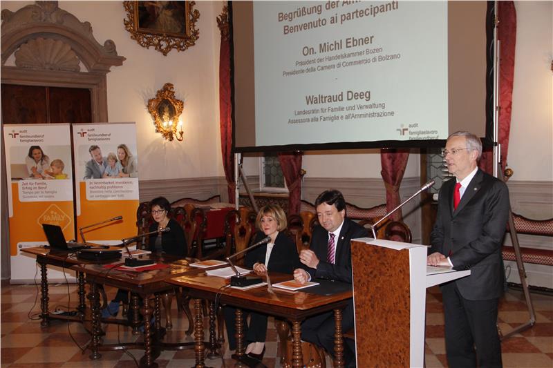 Familienlandesrätin Waltraud Deeg und Handelskammerpräsident Michl Ebner haben heute (22. November) im Bozner Merkantilgebäude an insgesamt 34 Arbeitgeber das Audit-Zertifikat überreicht. Insgesamt 22 familienbewusste Arbeitgeber hatten sich in diesem Jahr für das „audit familieundberuf“ entschieden und nun das erste Audit-Verfahren erfolgreich abgeschlossen, die übrigen zwölf haben bereits die weiteren Verfahrensschritte des Audits absolviert. Der Geschäftsführer der berufundfamilie Service Gmbh, Oliver Schmitz, und die Professorin an der Freien Universität Bozen, Federica Viganò, sprachen über die neuen Anforderungen für die Betriebe zur besseren Vereinbarkeit von Familie und Beruf.