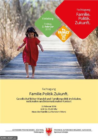 Bei der Tagung wird, neben Familienlandesrätin Waltraud Deeg, die ehemalige österreichische Familienministerin Sophie Karmasin über Schwerpunkte der österreichischen Familienpolitik berichten. Alfredo Ferrante vom Familienministerium in Rom, informiert über die familienpolitische Strategie der Regierung. Sonja Dörfler, Mitarbeiterin des Österreichischen Instituts für Familienforschung (ÖIF) zieht in ihrem Referat einen internationalen Vergleich europäischer Modelle von Familienpolitik, während sich der Demograf Alessandro Rosina (Università Cattolica Mailand) mit dem gesellschaftlichen Wandel und Zukunftsszenarien auseinandersetzt.