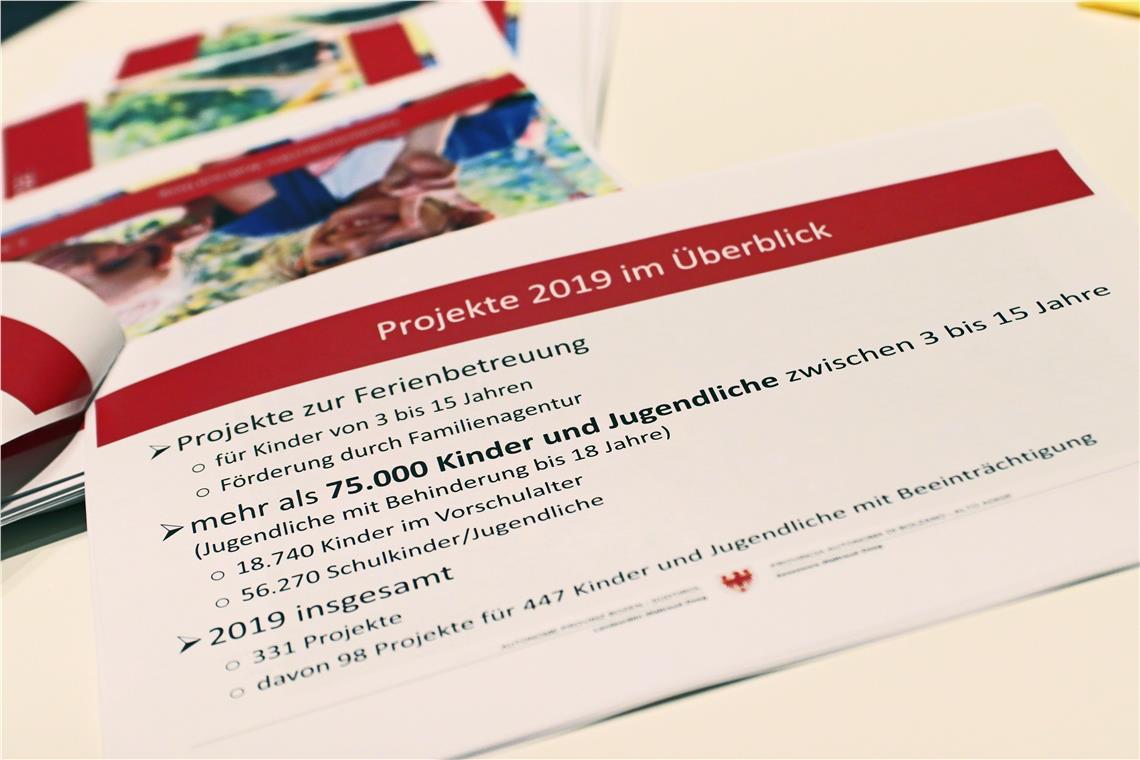 Insgesamt 331 Projekte wurden von der Familienagentur des Landes mit insgesamt 10,32 Millionen Euro finanziell unterstützt. Daran haben in diesem Jahr über 75.000 Kinder im Vorschul- (18.740) und Schulalter (56.270) teilgenommen. "Wenn man eines dieser Projekte besucht, erlebt man immer wieder wie begeistert die Kinder, aber auch die Betreuer diese Wochen erleben", berichtete Landesrätin Waltraud Deeg. Es sei darum mehr als gerechtfertigt, dass Land und Gemeinden diese Projekte finanziell unterstützen, auch um damit die Familien bestmöglich zu unterstützen. Sehr begrüßenswert sei zudem die Tatsache, dass auch Kinder und Jugendliche mit Behinderung im Sommer aus einem immer größer werdenden Angebot an Projekte auswählen könnten. In diesem Jahr wurden 98 Projekte organisiert, an denen 447 Kinder und Jugendliche mit Behinderung teilgenommen haben.