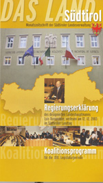 Regierungserklärung und Koalitionsprogramm sind nun vom Landespresseamt als Beilage zur Informationsschrift des Landes "Das Land Südtirol" veröffentlicht worden. Das 50 Seiten starke Heft wird allen Abonnenten der Landeszeitung kostenlos zugesandt. Es ist außerdem im Presseamt des Landes in Bozen, Palais Widmann, Crispistraße 3, erhältlich.