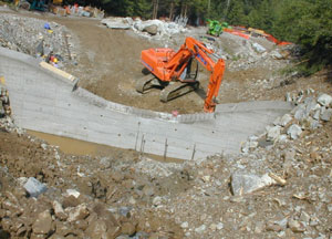Ab Mitte Mai waren daher die Arbeiter des Amtes für Wildbach- und Lawinenverbauung Ost am Weiderbach im Einsatz. Es galt, wo möglich, die beschädigten Sperren wieder instand zu setzen. Gleichzeitig wurde der Bau von sieben der zwölf geplanten neuen Sperren zwischen den bestehenden vorangetrieben und der Aushub mit Zyklopenmauern gestützt. "Die gesamten Arbeiten waren nicht einfach, weil die Baustellen schwer zugänglich waren und wir den Beton teilweise bis zu 200 Meter heranpumpen mussten", erklärt Vorarbeiter Peter Oberarzbacher.