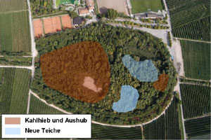Aus diesem Grunde werden im oberen Bereich sowie am untersten Ende des Beckens Bäume und Sträucher entfernt. Um die Kapazität des Beckens zu erhöhen, wird darüber hinaus Schotter entnommen. Gleichzeitig werden aber auch die zwei ursprünglich angelegten Tümpel im Becken wiederhergestellt, von denen einer in den letzten Jahren völlig verlandet war. So wird der Lebensraum von Amphibien, etwa Fröschen und Lurchen sowie von Vögeln aufgewertet, das im Becken belassene Totholz wird Insekten einen neuen Lebensraum bieten.
