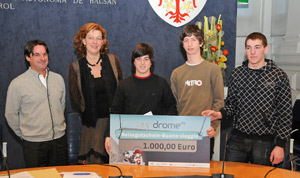 LPA - Aus dem Vinschgau kommen die ersten Etappensieger des Online-Jugenwettbewerbs Syndrome 09, den der Heimatpflegeverband Südtirol im Auftrag der Landeskulturabteilung zum Gedenkjahr 2009 entwickelt hat. Landesrätin Sabina Kasslatter Mur übergab heute (Freitag, 9. Jänner) dem dreiköpfigen Team SkiChallenge einen Reisegutschein über tausend Euro.