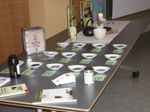 Damit es nicht bei der Theorie blieb, gab's an der Fachschule Haslach auch die Möglichkeit, Grünen Tee nicht nur als Teegetränk zu verkosten, sondern auch in Form von Grünteeschokolade oder einem Milchmixgetränk mit gemahlenem Matcha-Grüntee, einem der hochwertigsten Grünen Tees, der für die japanische Teezeremonie verwendet wird. Damit die Zuhörer des Vortrags außerdem einen Einblick in die vielfältige Welt des Tees bekommen konnten, standen verschiedene Sorten grünen, gelben, roten und weißen Tees zum Anschauen, Riechen und Fühlen bereit.
