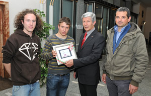 (LPA) "Vizeeuropameister" darf sich Stefan Donà, Viertklässler an der Fachschule für Obst-, Wein- und Gartenbau Laimburg, nennen. Oder genauer: Donà ist Vizeeuropameister der Weinbauschüler im Bereich Kellerwirtschaft und als solcher gemeinsam mit seinem Mannschaftskollegen Christian Runer heute (3. April) von Landesrat Hans Berger empfangen worden.