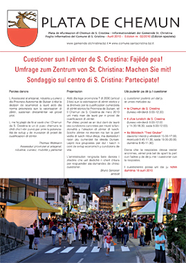 (LPA) Noch vor Ostern soll die Plata de Chemun, das Gemeindeblatt mit einem Fragebogen erscheinen. Alle Haushalte der Grödner Gemeinde St. Christina erhalten somit die Möglichkeit, die Zukunft ihres Dorfes mitzubestimmen. In Zusammenarbeit mit der Landesverwaltung und dem Handels- und Dienstleistungsverband Südtirol soll anschließend eine Arbeitsgruppe ein Projekt zur Aufwertung des Ortskerns beginnen.