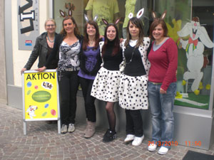 „Anspruchsvolle Verkaufssituationen meistern“ lautete der Auftrag der Unterrichtseinheit, der sich die Schülerinnen der dritten Klasse der Berufsschule für Handel mit ihrer Fachlehrerin Tatjana Kaserer gewidmet hatten. In diesem Rahmen war in rund 30 Arbeitsstunden eine österliche Sonderaktion für ein Modegeschäft in Schlanders entstanden. Kurz vor Ostern begannen die vier Schülerinnen mit der Umsetzung ihrer Ideen. Dafür wurden in der Fußgängerzone von Schlanders Passantinnen und Passanten angesprochen; je zwei der Schülerinnen verteilten in Hasenkostümen Faltblätter, auf denen auf die Aktion und das beteiligte Geschäft hingewiesen wurde. Im Schaufenster dieses Geschäftes hatten die Schülerinnen auch einen Blickfang positioniert. Die Schülerinnen hatten sehr viel Spaß an ihrer Arbeit, besonders freuten sie sich darüber, dass alle ihre Vorschläge vom beteiligten Geschäft in die Praxis umgesetzt wurden.